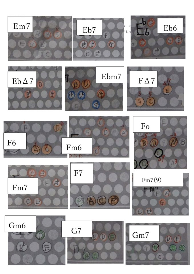 伴奏コードは、基本3と7なので、例の2-5-1の左ベースに右の2音を付けることに。