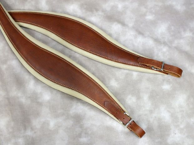本革製で、担いだ時の滑り具合がすばらしい! 左右非対称で、どちらがいいのか分からずしばらく使ってみてから決めようと思う。
