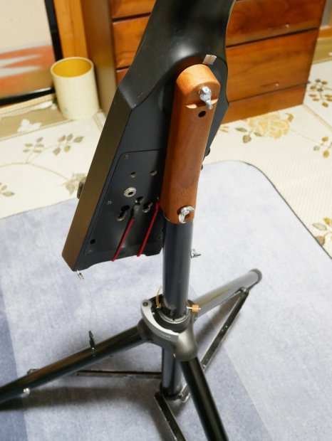 ただ、実際に演奏をしてみると、全体の重量バランスとネックを抑える左手の力の関係で、 重りを付ける必要があることがわかり、写真の様に3kgの重りを付けて バランスをとることにしました。