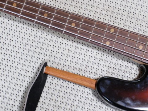 御覧のように、ピックアップ周りに手を入れていて、右親指とスラップの為の高さ調節板(?)を付けてあります。