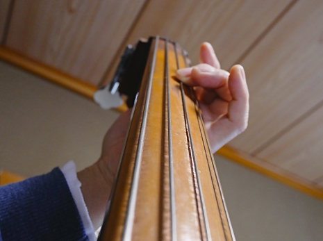 この時の問題は、左手の指板ポジションが、かなり上側になり、左腕のわきがかなりあき少し窮屈な感じになります。