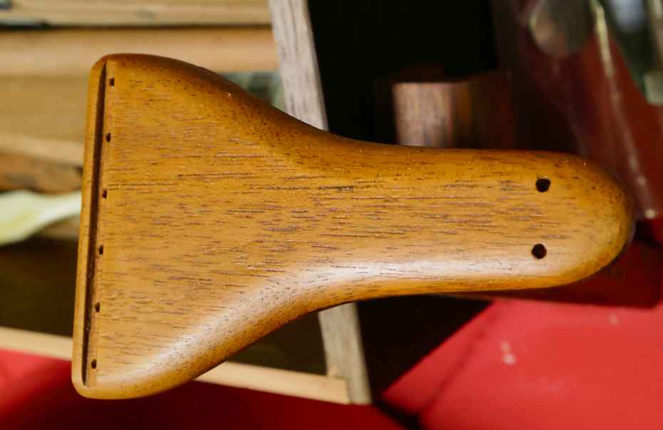写真のように、テールピース材料はローズとマホガニーをラミネートし強度を出してます。