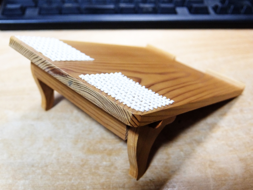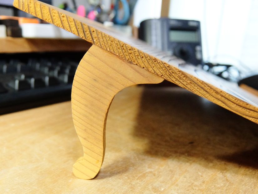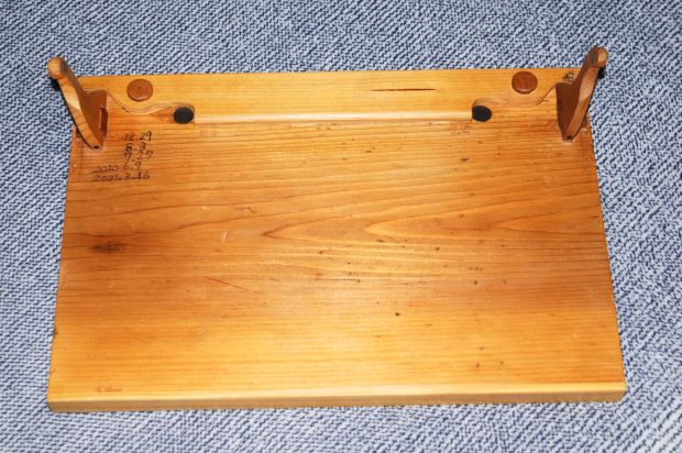 材料は、古い杉材(戸棚の扉)を使い、角度を付けるための台足は少ししゃれたものをとおもい猫足風のものにしました。