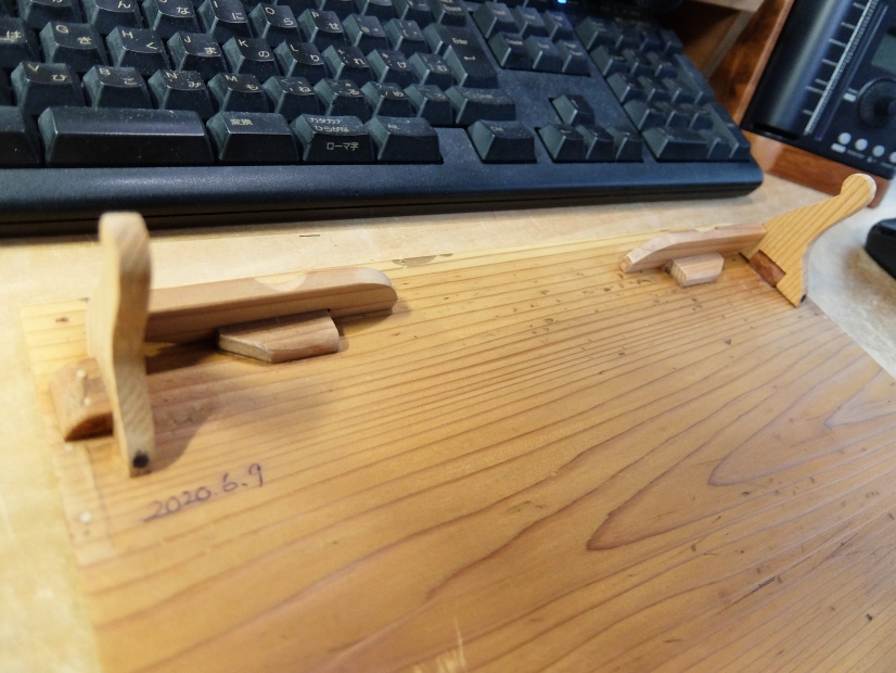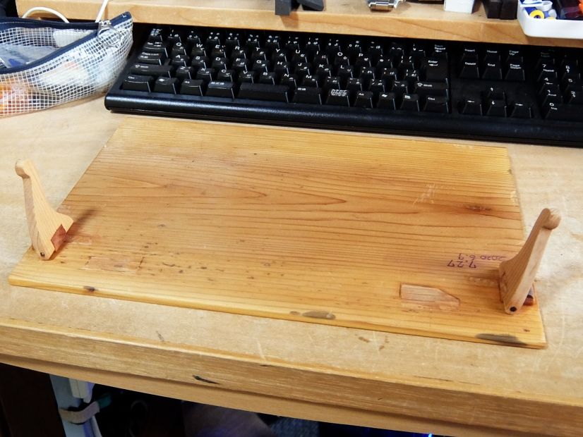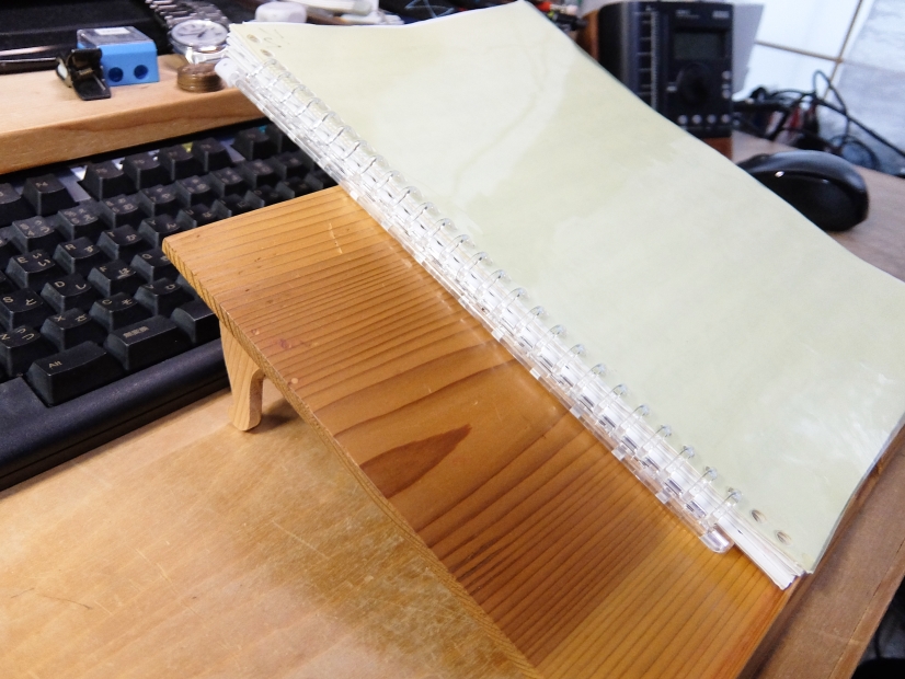 そこで、机用の譜面台を作ることにして、写真のようなものを作りました。