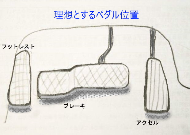 アクセルと同様にかかとを付けた状態で運転するには、ペダル位置が非常に重要で、普通のペダルの高さだと、左足はフットレストか床に置くことになる。