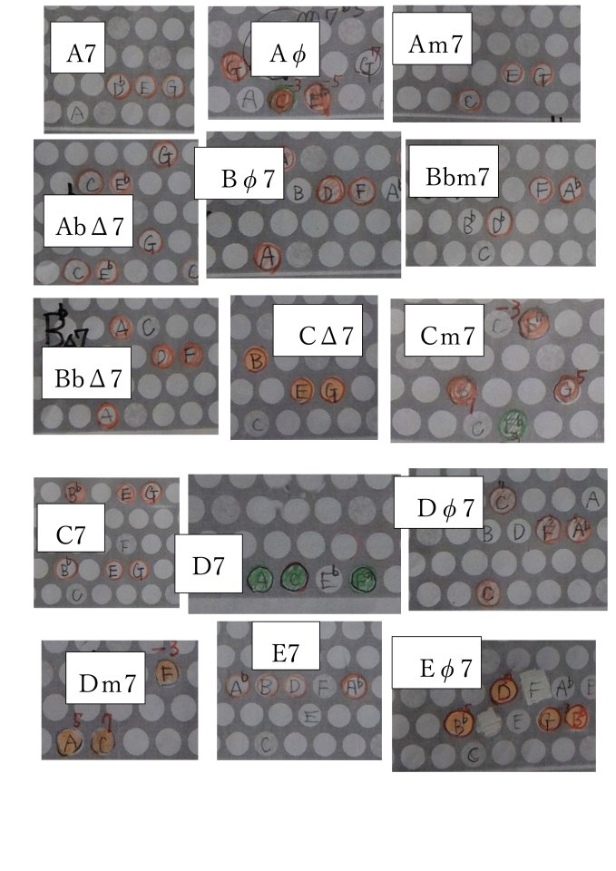 伴奏コードは、基本3と7なので、例の2-5-1の左ベースに右の2音を付けることに。
