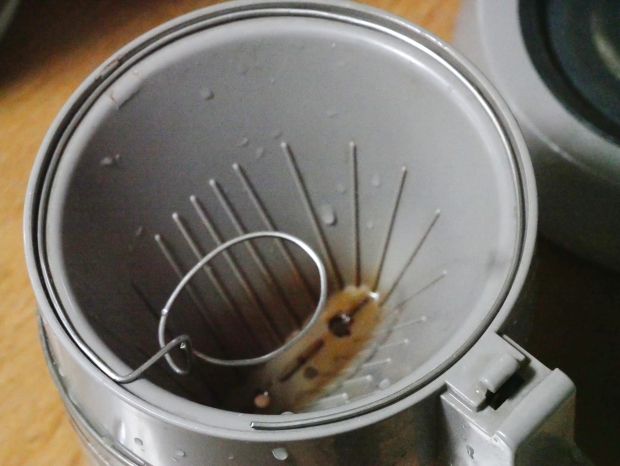ところが、やってみるとコーヒー部分はコップには収まるようにできているのですが、ペーパーの入るロート状の入れ物にはぴったり収まりません。