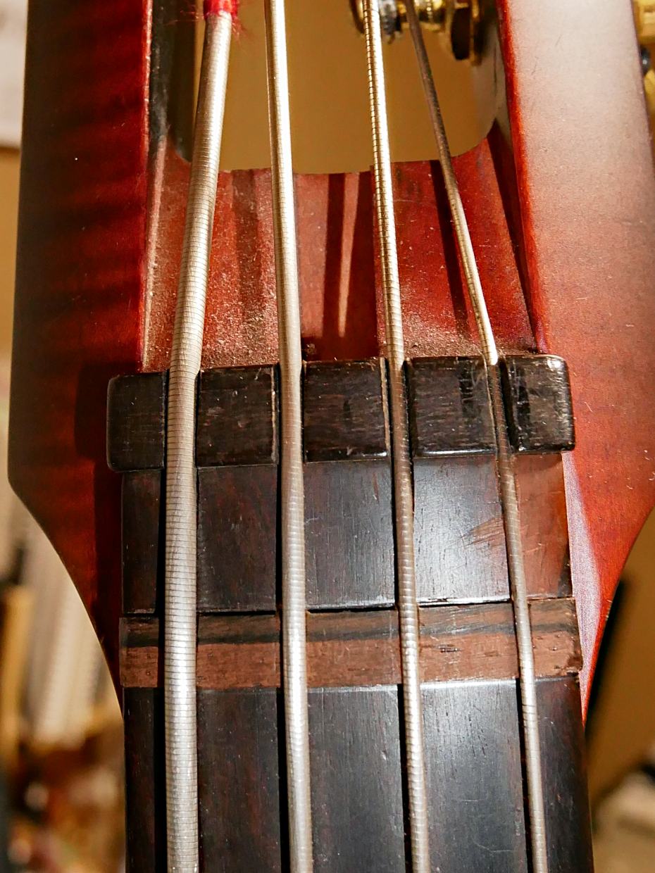 弦長は106mmでしたが、コントラバスの弦長に合わせ104に、サドルを20mm移動しております。少し張りが緩くなった感じですが、特に音色的な違いは生じていないと思います。ただ、ポジションマークが低いほうでずれていますので、全くあてになりません。