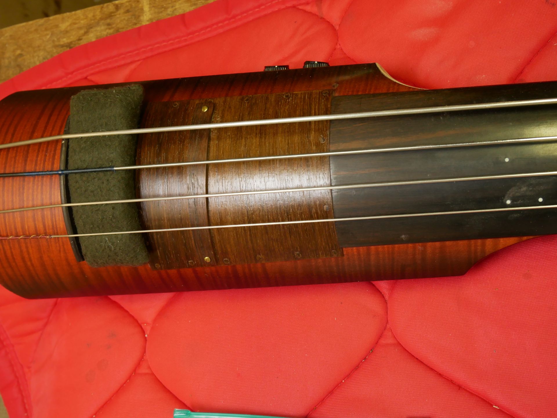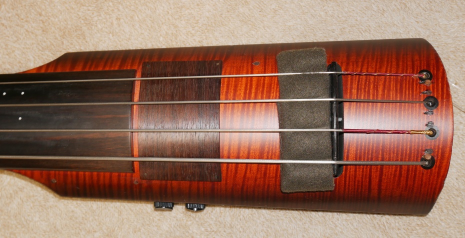 駒付近にフェルトを挟み込みサステインを少し短めにしています。そのままだと、コントラバスとの差があまりにもあるためです。ソロのときなど、むしろサステインが短くなりモコモコしたいい感じになります。