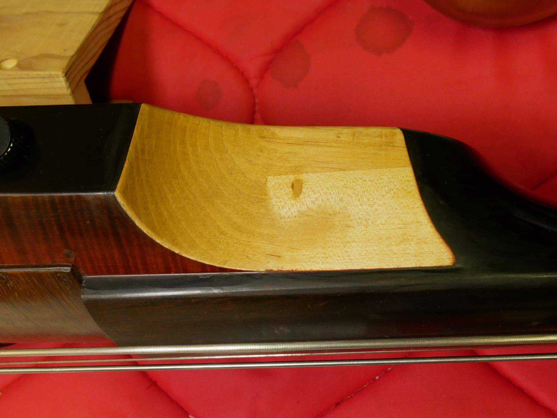 コントラバスと同じ様に弦幅と弦高を変えたら、今度は右手の位置がしっくりこなくなり、ご覧のように削ることになりました。
