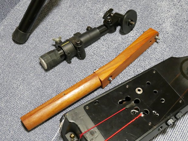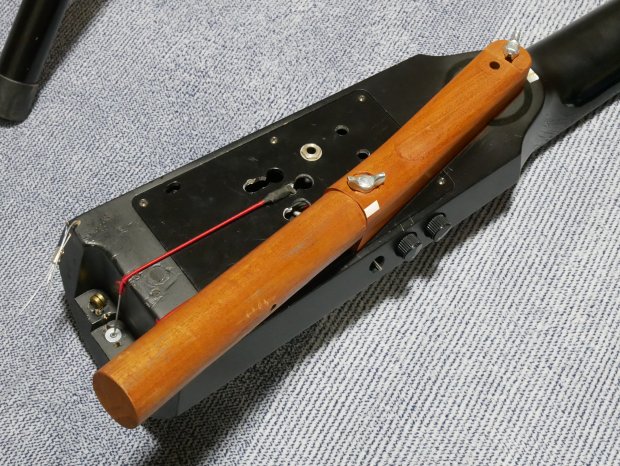 ただ、実際に演奏をしてみると、全体の重量バランスとネックを抑える左手の力の関係で、 重りを付ける必要があることがわかり、写真の様に3kgの重りを付けて バランスをとることにしました。