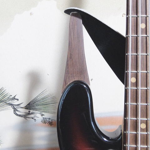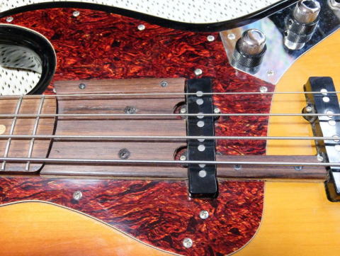 御覧のように、ピックアップ周りに手を入れていて、右親指とスラップの為の高さ調節板(?)を付けてあります。