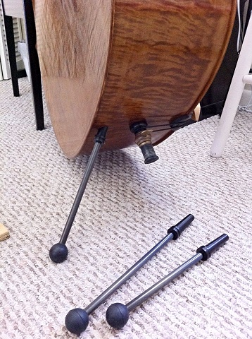 さて、自作エンドピン(マホガニー)ですが、写真のとおり21φで、ただ差し込むだけの簡単な作りです。穴はすでにテーパーを付けてありますので、あとは自分の高さに合わせて長さを決めるだけです。エンドゴムは、ステッキ用を購入。エンドピンホルダ付近で少しグラグラしますが、使えないことはない。しばらくは2本持ちで行こう。