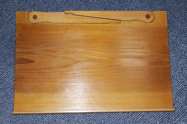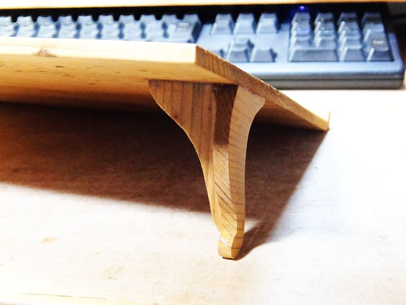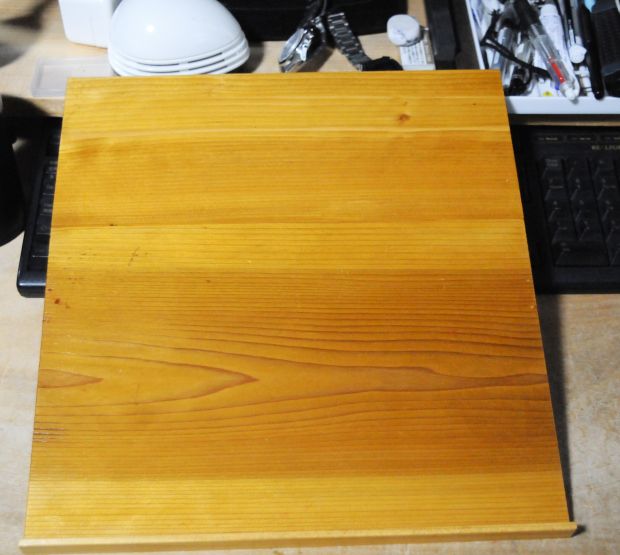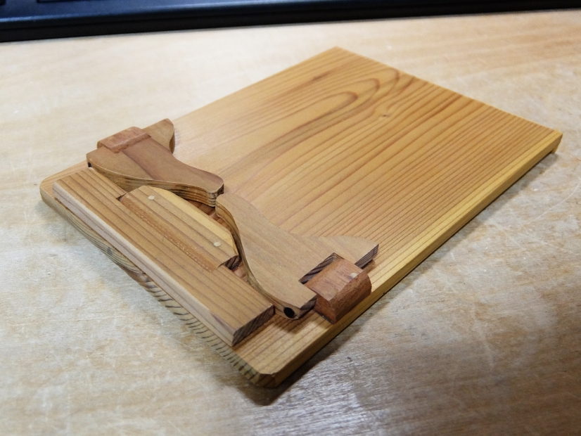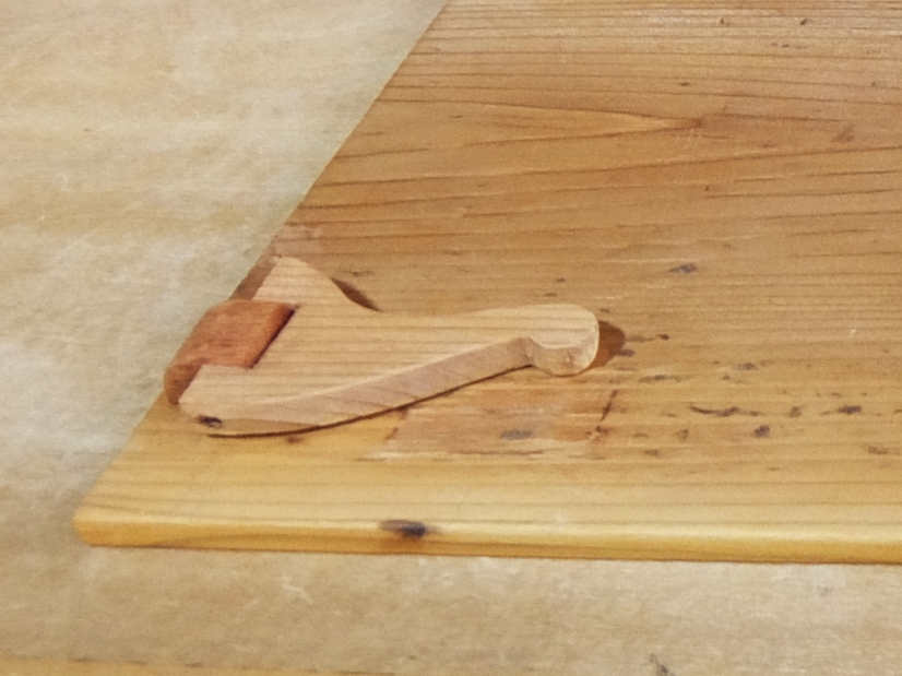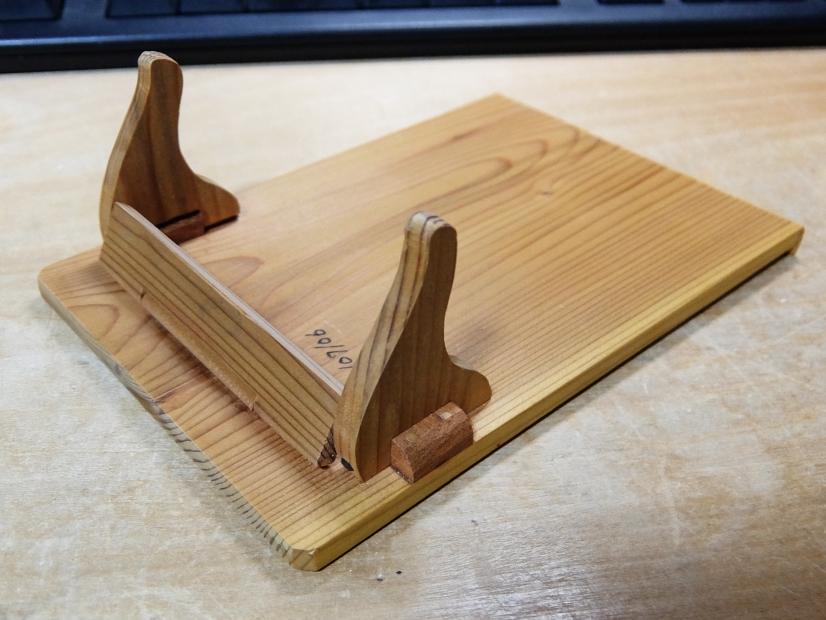 材料は、古い杉材(戸棚の扉)を使い、角度を付けるための台足は少ししゃれたものをとおもい猫足風のものにしました。