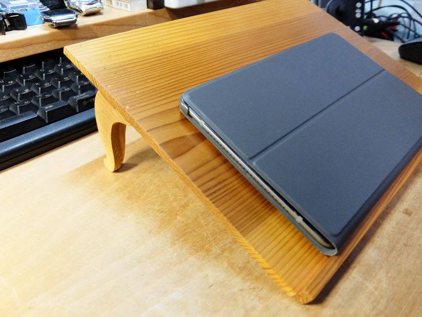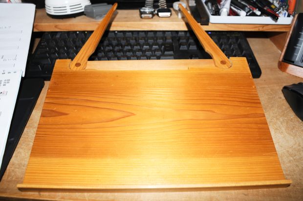 そこで、机用の譜面台を作ることにして、写真のようなものを作りました。