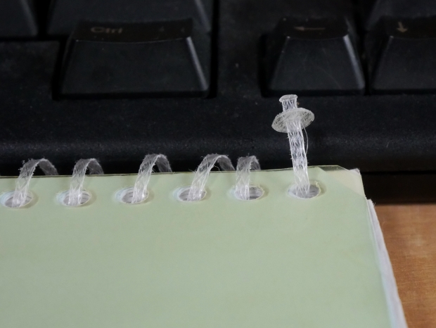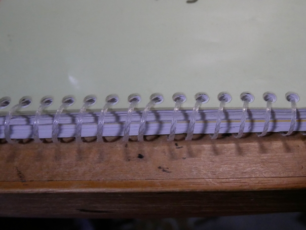 ステンレスワイヤーでやってみたら、きちんと綴じられたが、開いたときに両側がかなり広がるのと、ゴワゴワして使いにくい。